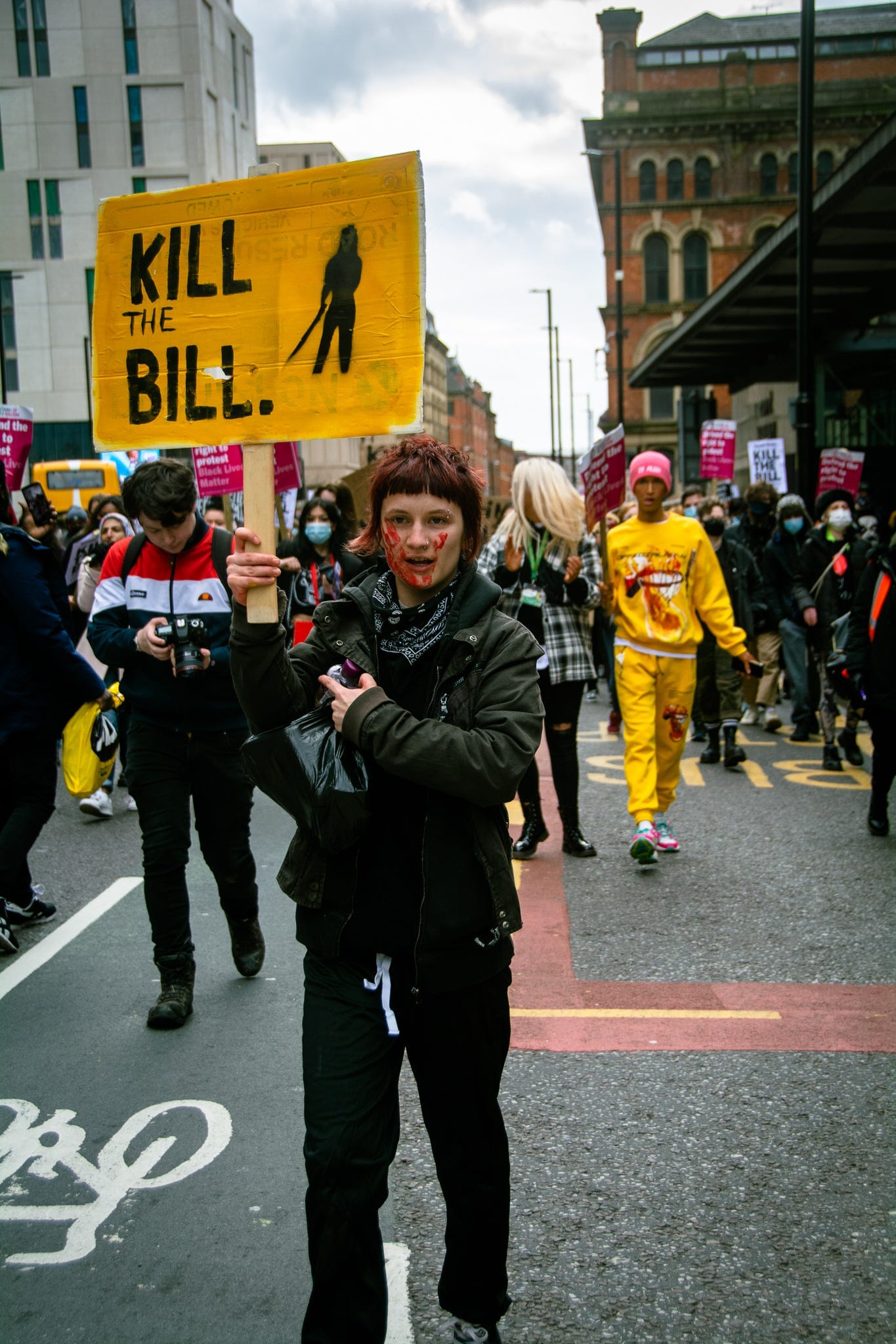 A protestor holding a placard at Saturday’s ‘Kill the Bill’ protest, organised by the ‘Stand up to Racism’ group to object to the government’s controversial policing bill (Photos: Dani Cole/The Mill). The demo stopped trams and traffic on Portland Street, and some protesters chanted “All cops are bastards” at officers in nearby police vans. When the demo moved to Stevenson Square, participants knelt silently for 8 minutes next to the George Floyd memoria. To see our photos and quotes from the protest, head to our Twitter account. Eventually, police cleared the remaining protesters from the road and made 18 arrests.
