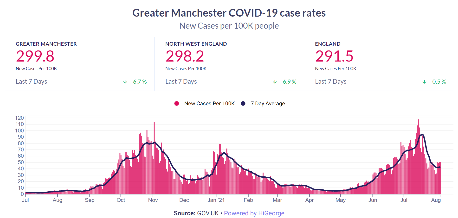 - Vaccinations: Just over 1.5 million people in GM (or 63% of adults) have now had two doses of a Covid-19 vaccine. 92% of over-70s have received their second dose, 85% of 50-69s, 45% of 18-49s. These numbers were updated on 1 August, and for context, the number of GM residents who are double jabbed has only risen by 207,927 since 3 July, which shows how the vaccine programme has slowed down recently. If that pace continues, it would theoretically take until after Christmas to vaccinate every adult in GM.