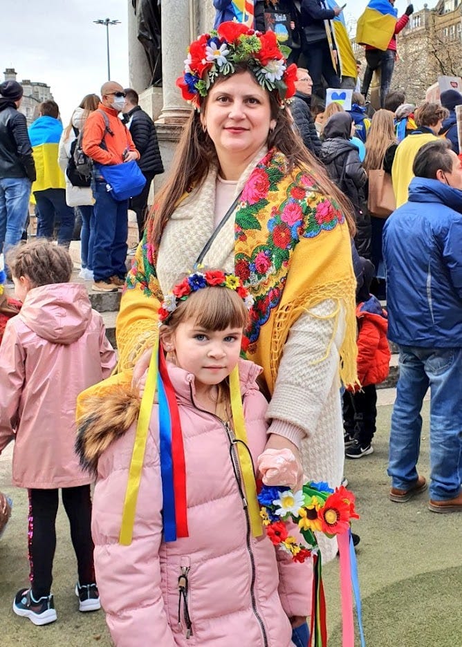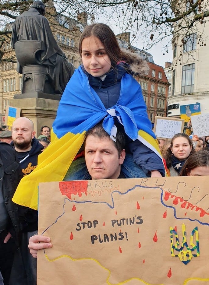 “We had to flee via Poland,” she explains quietly, with the sounds of an emotional protest on the edge of Piccadilly Gardens sometimes drowning her out. She was with her husband in Kyiv and someone needed to get back to look after the children. Dariya calculated that she had to go with him. “He’s not Ukrainian, he wouldn’t be able to get to the border without me,” she says.