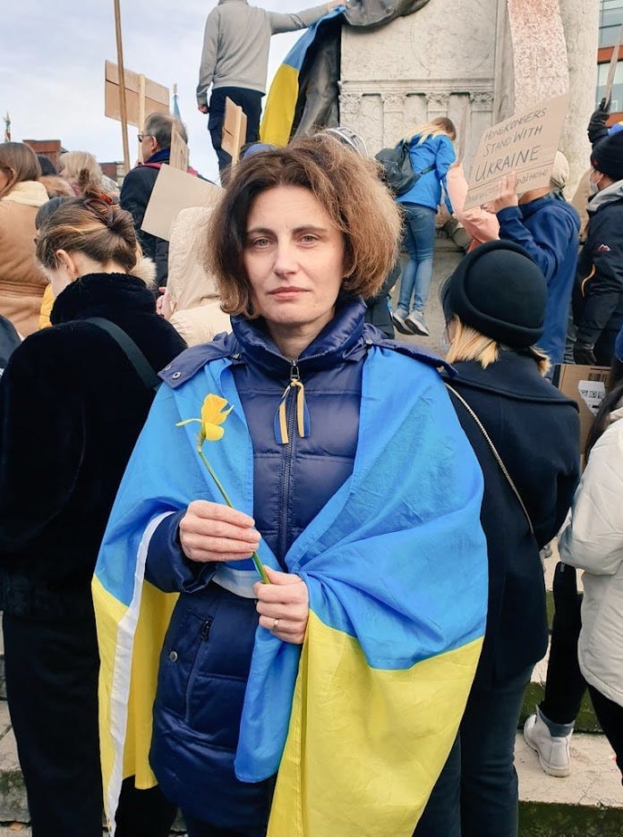 This time last week, Dariya Mykhayliv was in Kyiv saying goodbye to her mother, who had been critically ill and died a few days before war broke out. “We just managed to have the funeral,” says the 47-year-old, who is wearing a Ukrainian flag over her shoulders and holding a daffodil given to her by a stranger in the crowd. When the Russian invasion began, it was impossible to fly back to the UK, where Dariya works as an economics lecturer and lives with her husband and two teenage children in York.