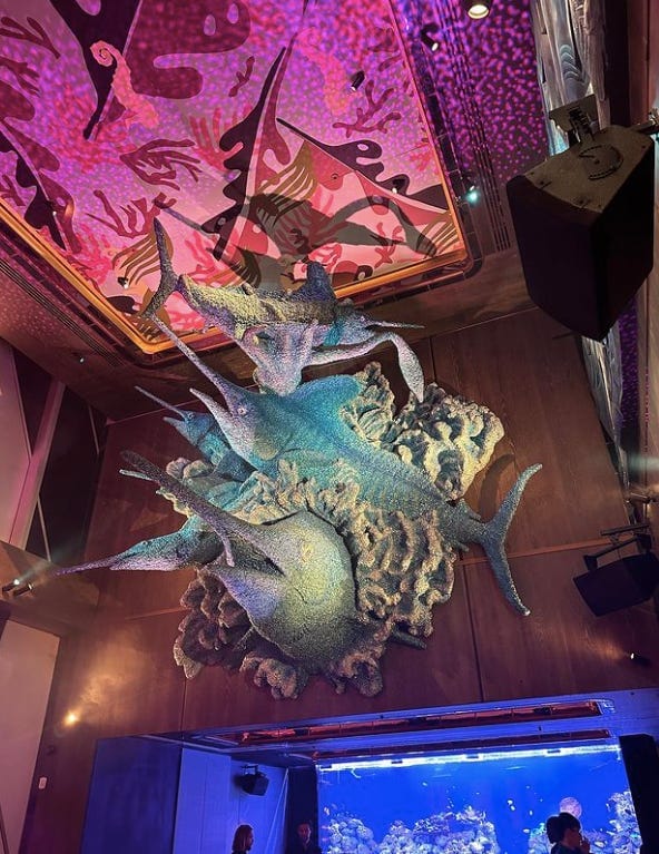 Mostly, the answer comes in the form of giant, theatrical sculptures. A flotilla of glittery swordfish, designed by the artist Damien Hirst, erupts from one wall, while giant columns shaped like tentacles and designed by Venetian glassmakers pulse with pink light. Fish-shaped lamps by the architect Frank Gehry frame a bar made of pink onyx.