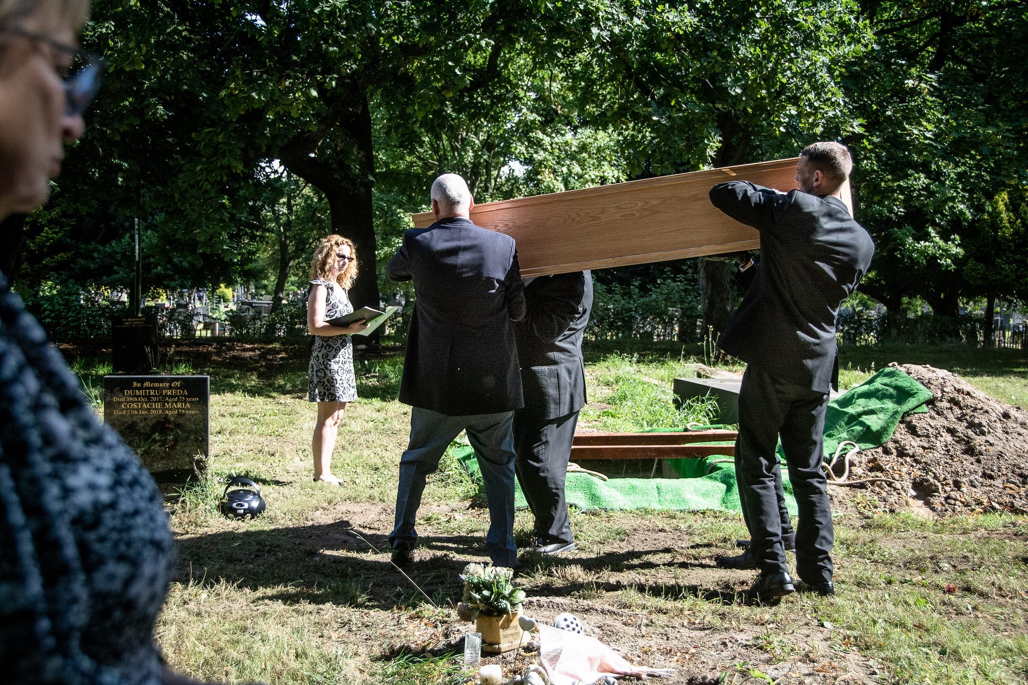 The funeral was due to start at 10:30 in the morning. As the minutes ticked down, no relatives or friends appeared at the gates of the cemetery. As we waited, I chatted with the celebrant Hayley Cartwright, who had written the Facebook post. She was wearing a short-sleeved tea dress, printed with black roses and a black sash tied around her waist. She’s an actor — she plays the celebrant Hazel on Coronation Street — and during the Covid lockdowns she trained up to do the role in real life.