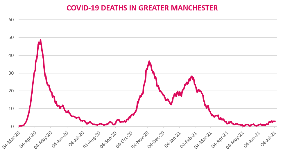 Hospitalisations: As of last week, there were 63 patients with Covid-19 in critical care in Greater Manchester, an identical number to the week before and still well below the peak of 170 we saw in February.