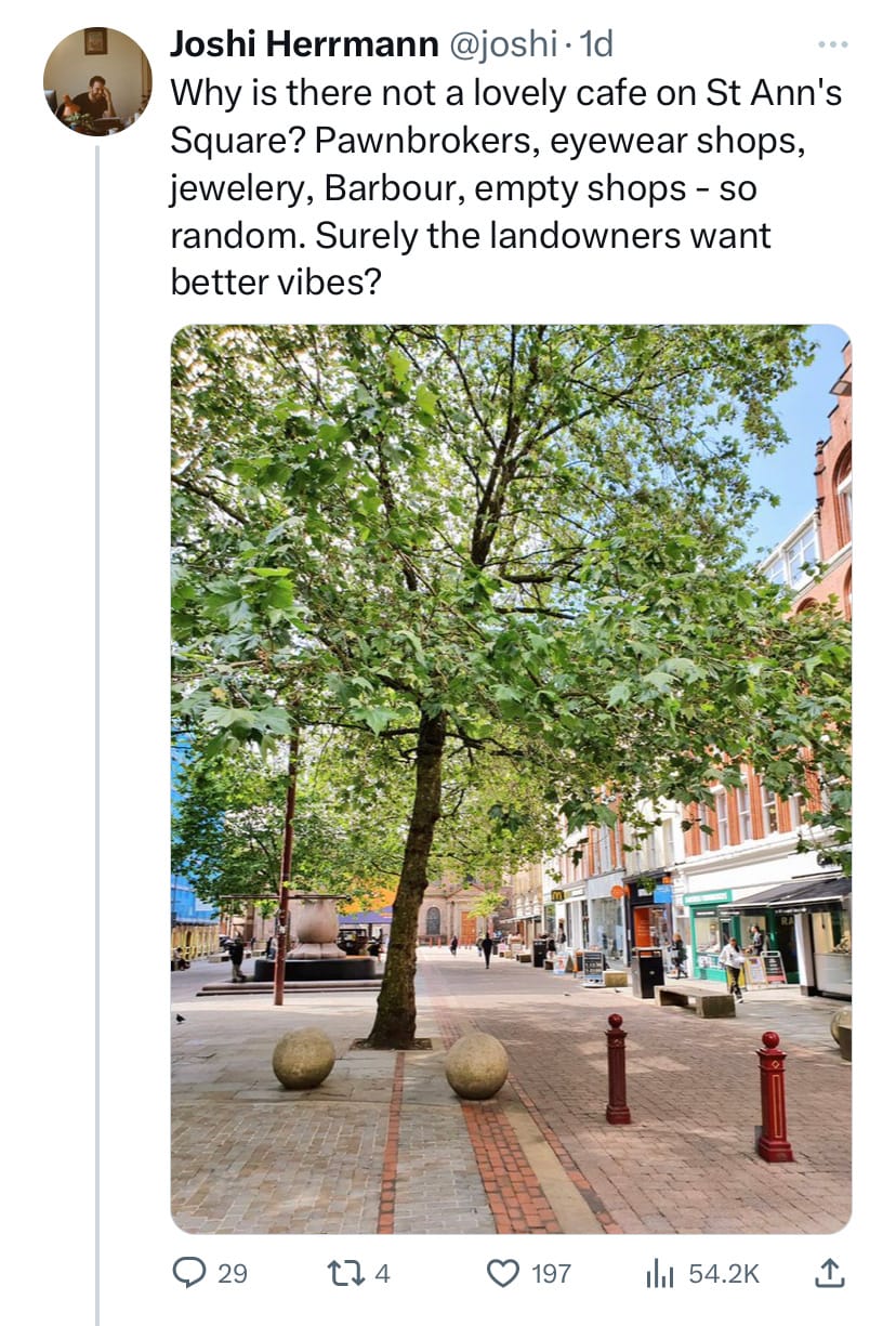 We set off a Reddit discussion about St Ann’s Square yesterday. Right on the doorstep of Mill HQ, it feels like the square doesn’t get as much use as it could. And there’s a conspicuous lack of independents, especially disappointing seeing the number of empty units that face right on to the square. There is untapped Parisian café potential here. It’s a travesty.