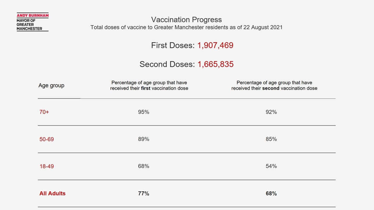 - Covid-19 update: The case rate for Greater Manchester is 301.2, down 3.3% from last week, compared to England’s 326.6, up 6.2%. Infection rates are highest in Salford, around 300, and the lowest is in Bolton, around 200. Figures released today show that as of Sunday, 68% of all adults in GM have had both doses of the vaccine, including 54% of 18-49s. See the graphic below for more details. The number of Covid-19 patients in critical care is now 59, down from 62 the previous week. Overall hospital occupancy for Covid patients (outside of critical care) is slightly up — now 351 compared to 302 last week. Find the hospital data here.