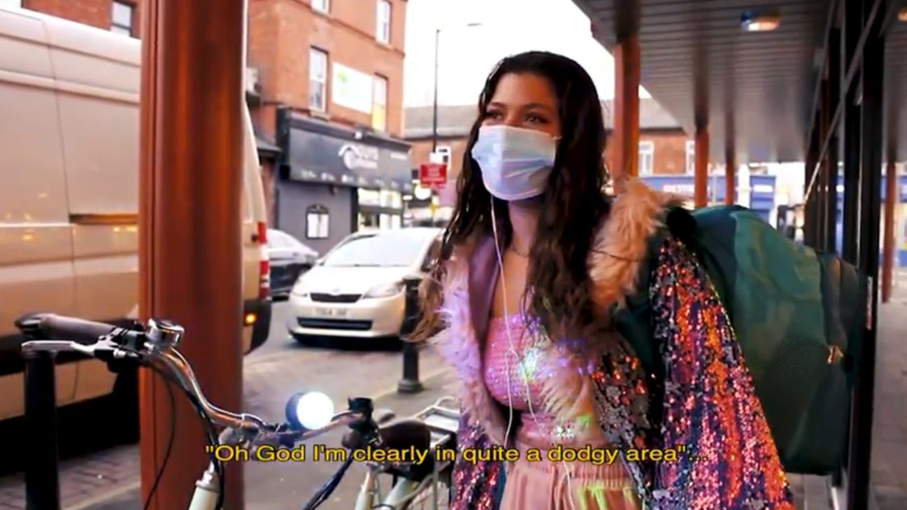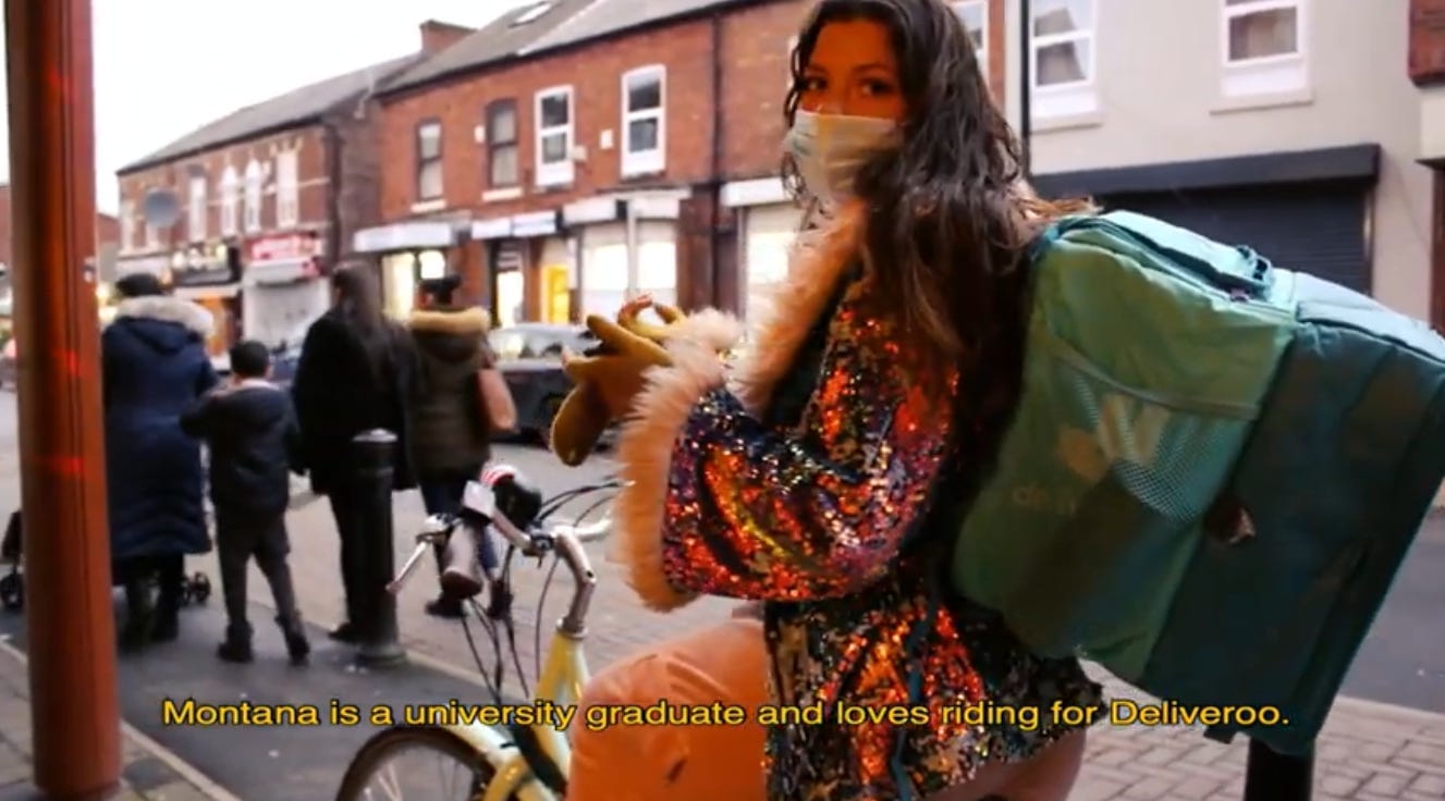 Montana, 23, who shimmers in a sequined jacket trimmed with faux-fur during her interview for the film, worked as a Deliveroo rider after graduating from MMU. She enjoyed cycling and for her birthday, her friends chipped in and she was able to buy an electric bike. From September 2020 she rode around Manchester with disco lights flashing and a Bluetooth speaker playing music, and only stopped when it got too cold about five months later. “I just really like that I can go round and just kind of do what — don’t tell Deliveroo — but what I’d probably do for free,” she told Jack, smiling.
