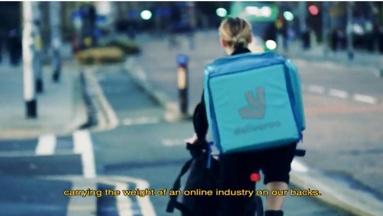“If you love cycling, having a healthy lifestyle, and also earning on your schedule, congrats!” shouts a job ad for Deliveroo in Manchester sunnily. “Deliver food from Deansgate and Castlefield to homes in Burnage and Salford Quays, and also enjoy free time in between.”