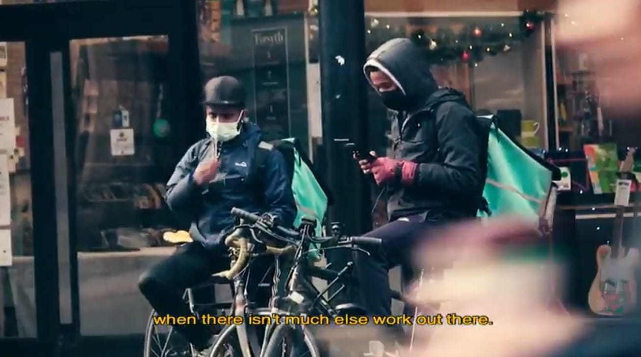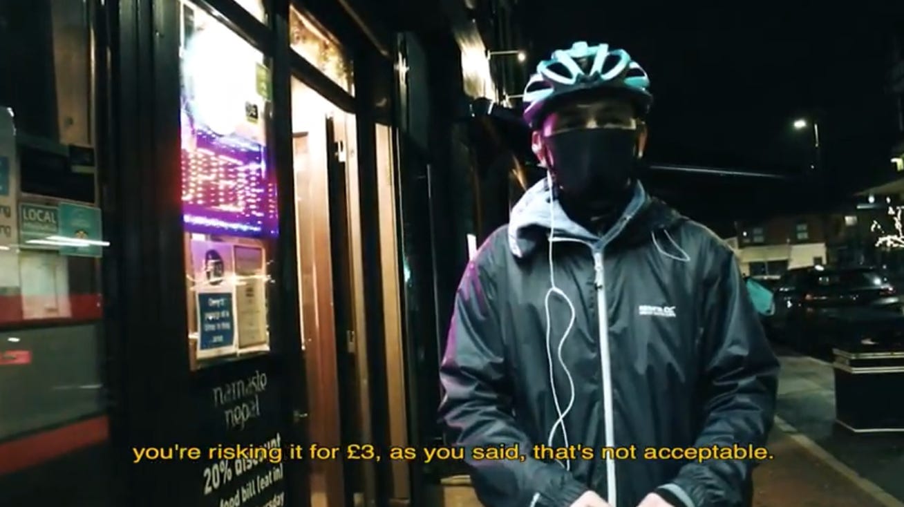 Ahmed, the rider from Sudan who we profiled earlier this year and who didn’t want to appear on camera in the film, told Jack he likes the flexibility of working for an app but could only make decent money on the weekends. He was earning between £200 and £400 per week while he learned English to support his university application. He also mentioned a downside highlighted by various riders: poor treatment from the restaurants they are picking up from. Some of them “treat you like less than other people,” Ahmed told us.