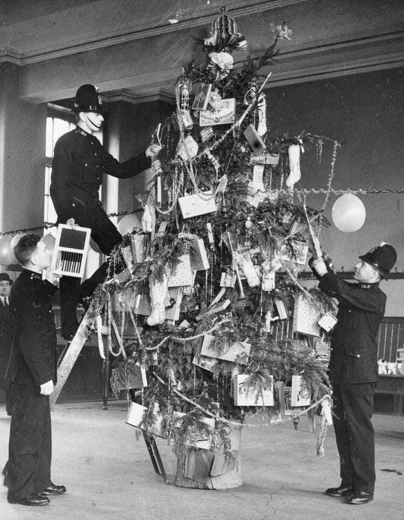 Bobbies decorating a Christmas tree for local children from deprived backgrounds at their station at Mill Street, 1936. Photo: Fox Photos/Getty Images.