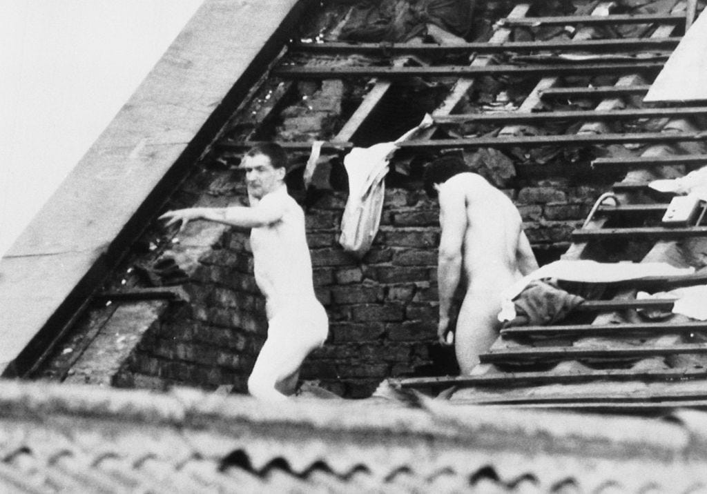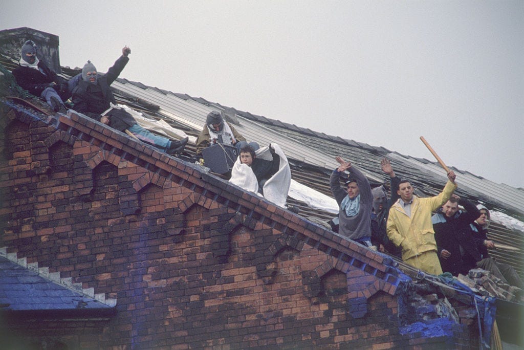 The morning of Tuesday, April 3rd 1990 dawned as a cold, wet spring day, not a good start for the 10 or so prisoners who had just spent their second night on the roof of Strangeways prison in Manchester. They were huddled together wrapped in flimsy prison blankets and their day clothes. 100 feet below them the ground was littered with bricks, slates and drainpipes thrown down at prison officers who for the previous 38 hours had tried to stop Britain’s worst prison riot.