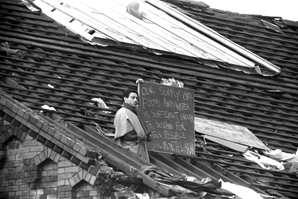 They also wanted assurances from me that if they came down they would get hot baths, meals and cigarettes (which they were eventually given). Moments later a rooftop protestor shoved a huge coping stone off a ledge, plunging 100 feet down right in front of me.