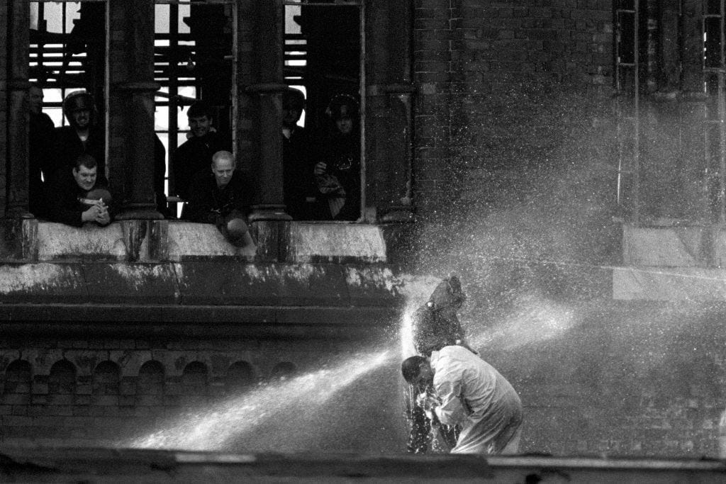 Broken tiles, bricks, scaffolding and planks littered the yard. The building facing us was clearly also occupied as debris kept on raining down into the empty space between us. The police helicopter hovered overhead, its siren shrieking away. Under the huge archway of the entrance 30 prison officers in full riot gear, carrying batons and shields, waited ominously. A limp Union Flag hung at half-mast from a pole outside the entrance into F Wing. Prisoners danced on a roof.