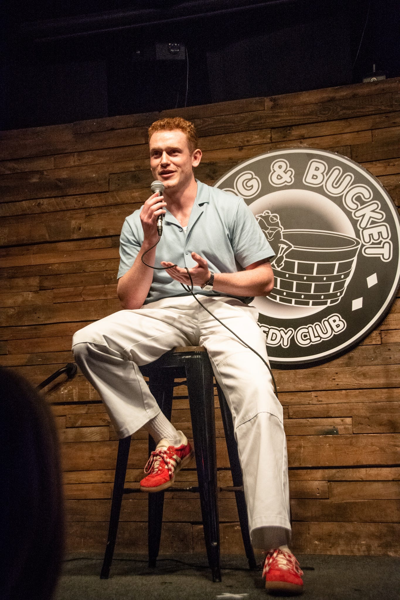 The Frog and Bucket is ruthlessly air conditioned, smells like a Wacky Warehouse and its ceiling is painted the colour of baked beans. On the walls are pictures of previous performers who went on to stardom: Peter Kay, Sarah Millican, Steve Coogan. Students sit at the tables crowding the stage, stirring cups of tea and coffee.