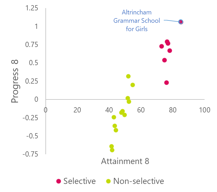 There’s also a big difference between how some of the GM local authorities are doing. One stands out for its good performance — Trafford. Trafford isn’t just third on our chart, but third in the country. If you want to know what it’s doing right, then break down the schools by one vital characteristic: whether they select students based on academic ability.