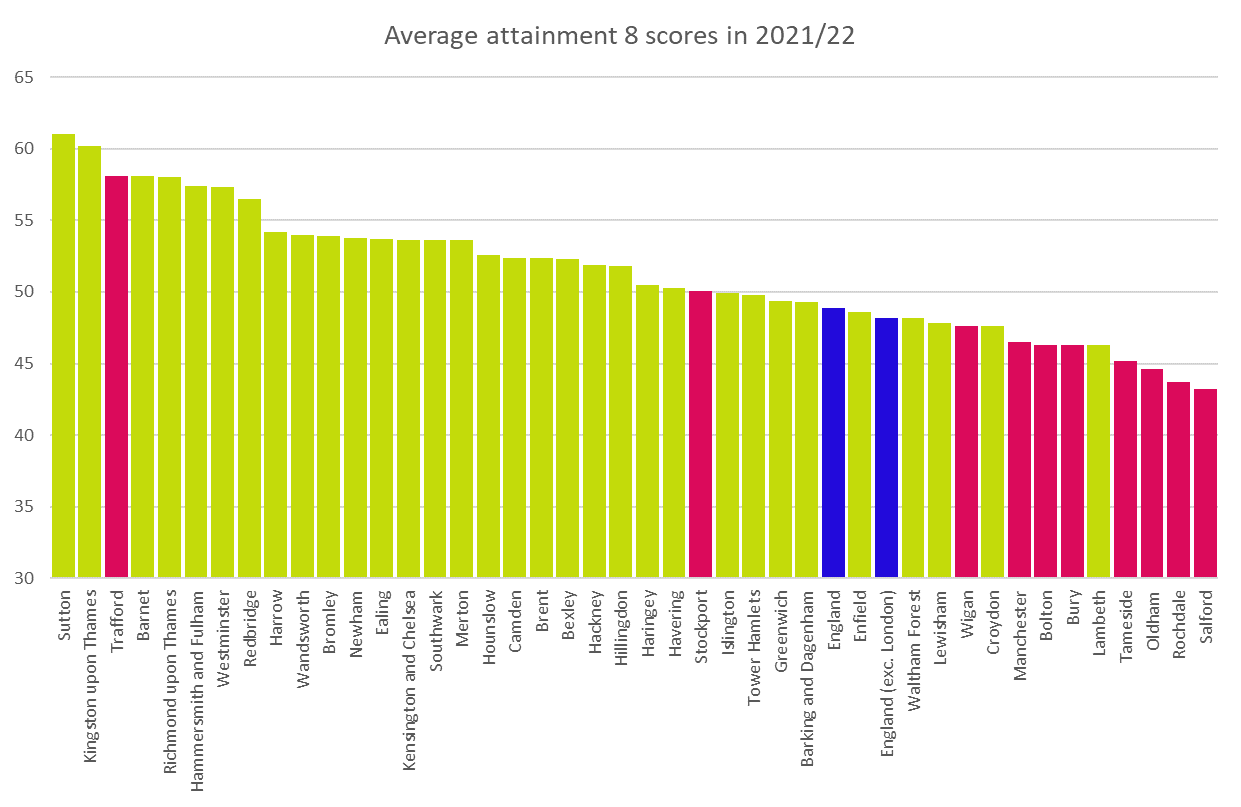 Look at how GM boroughs stack up now, and it’s a much less flattering picture. Eight GM boroughs now fall below the national average, with Rochdale and Salford especially far behind (they are now in the bottom ten out of 151 local authorities in England for Attainment 8). And the contrast with London is stark. The vast majority of London boroughs overperform the national average, but the majority of GM boroughs underperform it. The worst-performing London borough — Lambeth — is still better than Tameside, Oldham, Rochdale, and Salford. The conclusion holds up even if you remove London from the England average.