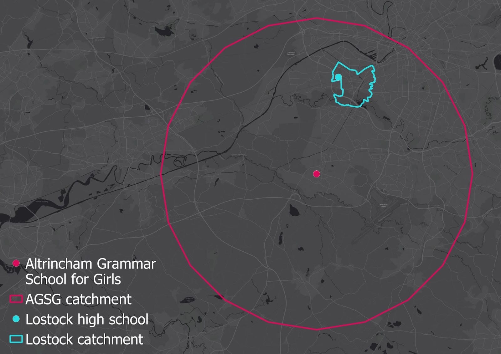 Trafford’s selective schools also pull in more able students from other boroughs. Compare, for example, the catchment areas for the Altrincham Grammar School for Girls (AGSG), and the catchment area for the non-selective Lostock High School (LHS). For LHS you have to live in the M32 postcode area — whereas for AGSG you need to live within eight miles of the school. That’s a much wider area, stretching well into neighbouring boroughs — and in previous years students have been admitted from over ten miles away.