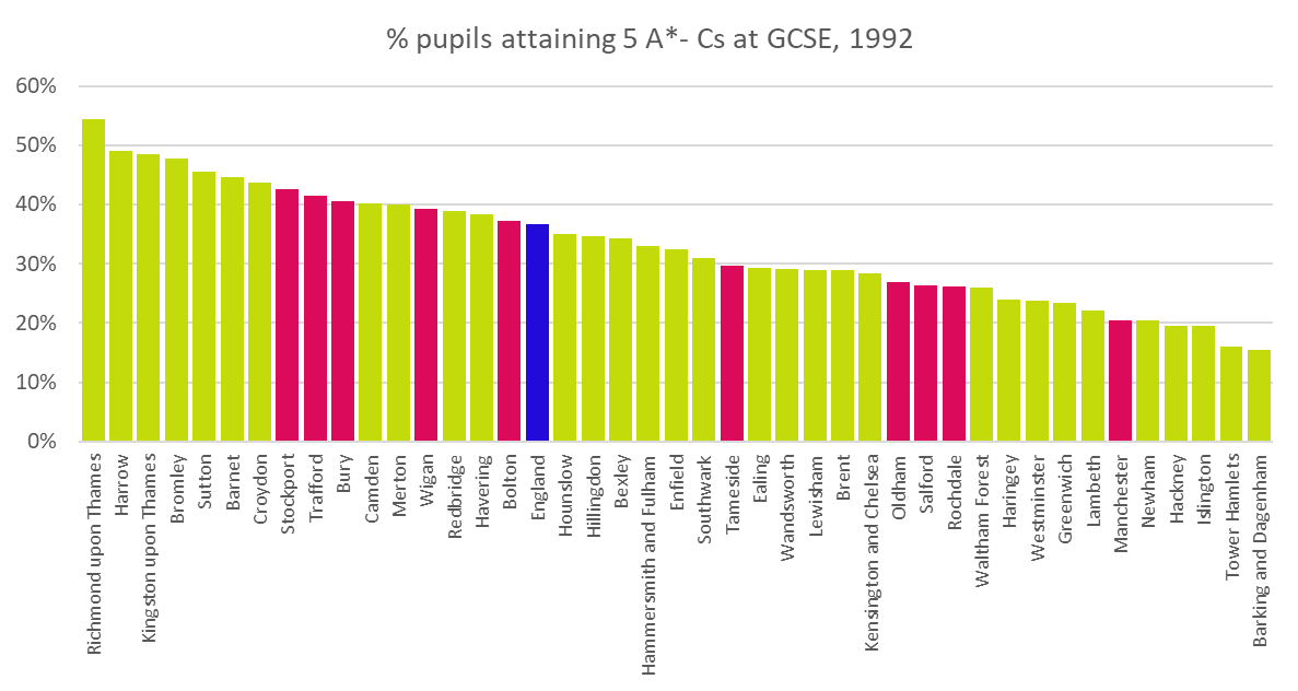 But Ofsted results are only one way to measure how schools perform. There’s another, perhaps cruder, metric: results. In 1992, half of Greater Manchester’s boroughs had better results than the national average, if you look at the proportion of students getting more than 5 A*-Cs. (Manchester itself lagged the other boroughs by some distance).