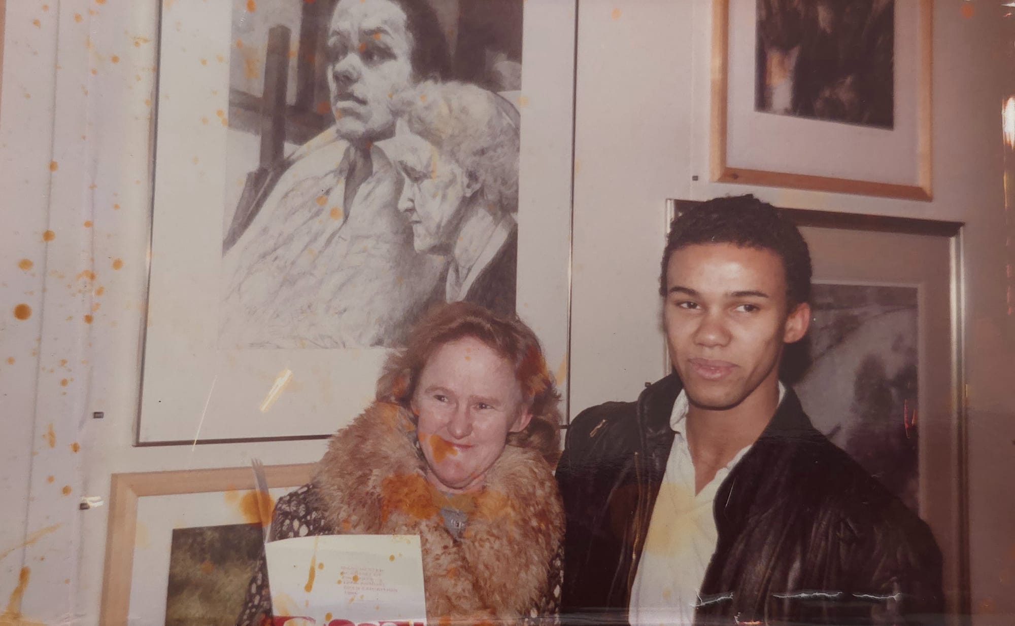 Michael’s life was always a far cry from the royalty and decadence so frequently depicted in his art. He was born in Moss Side, in a back-to-back terraced house with an outdoor toilet. His father was from St Vincent, part of the Windrush Generation, and he left Michael and his mother when he was two years old, taking his younger brother with him. Michael barely knew him. “But he looked like a decent bloke actually,” he says. “He left my mum because of the booze.” His mother was an Irish immigrant, though neither of them ever knew from where. An adoptee, crippled in the Blitz as an infant, she grew up in Bollington, a small town in Cheshire, with no idea who her family was. By the time Michael was born, she’d had two children from a different father taken off her, and was addicted to alcohol. Michael shows me a photo of her reclining on a brown leather sofa with her boyfriend at the time, a half-drunk jug of lager raised to the camera. “I’d do drawings of her when I was young,” Michael tells me. “There was a Renaissance-style integrity to her appearance.”