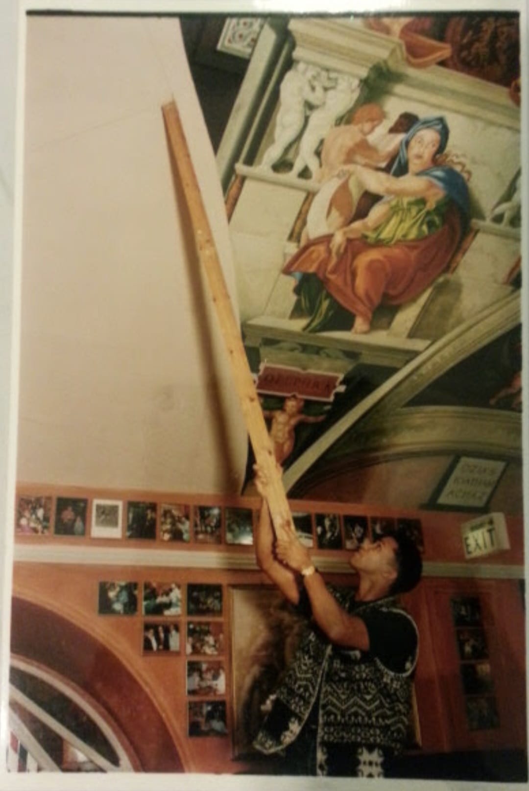 He didn’t stay long in London. Soon after graduating, Michael returned to Manchester and to his mother, and after a few years began work on a peculiar project which was to bring him unprecedented global acclaim. The owners of Cocotoo restaurant near Oxford Street station had asked him to create a scaled-down rendition of Michelangelo’s Sistine Chapel painting on the restaurant ceiling. “I told them I could do it within four months,” says Michael. “I ended up spending two years on it.” Painting publicly from a platform above the diners’ heads, Michael had hoped that the spectacle would gain him some publicity, but none of the newspapers showed any interest — until one morning a journalist from the Sale and Altrincham Messenger got back to him, suggesting that they do a feature. The morning after the feature came out, Michael was all over the national and international news. The Daily Mail did a multi-page spread on him, and NBC came to film him painting for two days. “People came from America to see it,” Michael laughs incredulously. “They’d go see the Sistine Chapel in Rome, and then they’d come to Manchester to see it again in a restaurant.” He recalls with a particular surge of excitement how Pavarotti himself came to visit him while painting. “He loved it!” says Michael. “He had a massive dinner at the restaurant. He had to sit on two chairs side by side cause he’s so big.”