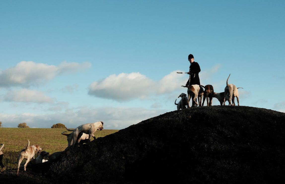 There are also occasional pockets of kinship between the two sides. Some of the pay-in field-riders (non-regulars who join the hunt on occasion for a fee) bond with sabs over a shared love of horses, allowing them to be petted and striking up friendly conversation. However, shortly after lunch, “second horsing” occurs. The casuals head home at this juncture and the regulars switch to fresh horses, ready to double down for the afternoon. This is when the atmosphere sours. Before long, a local farmer comes striding across the field mouthing various obscenities.