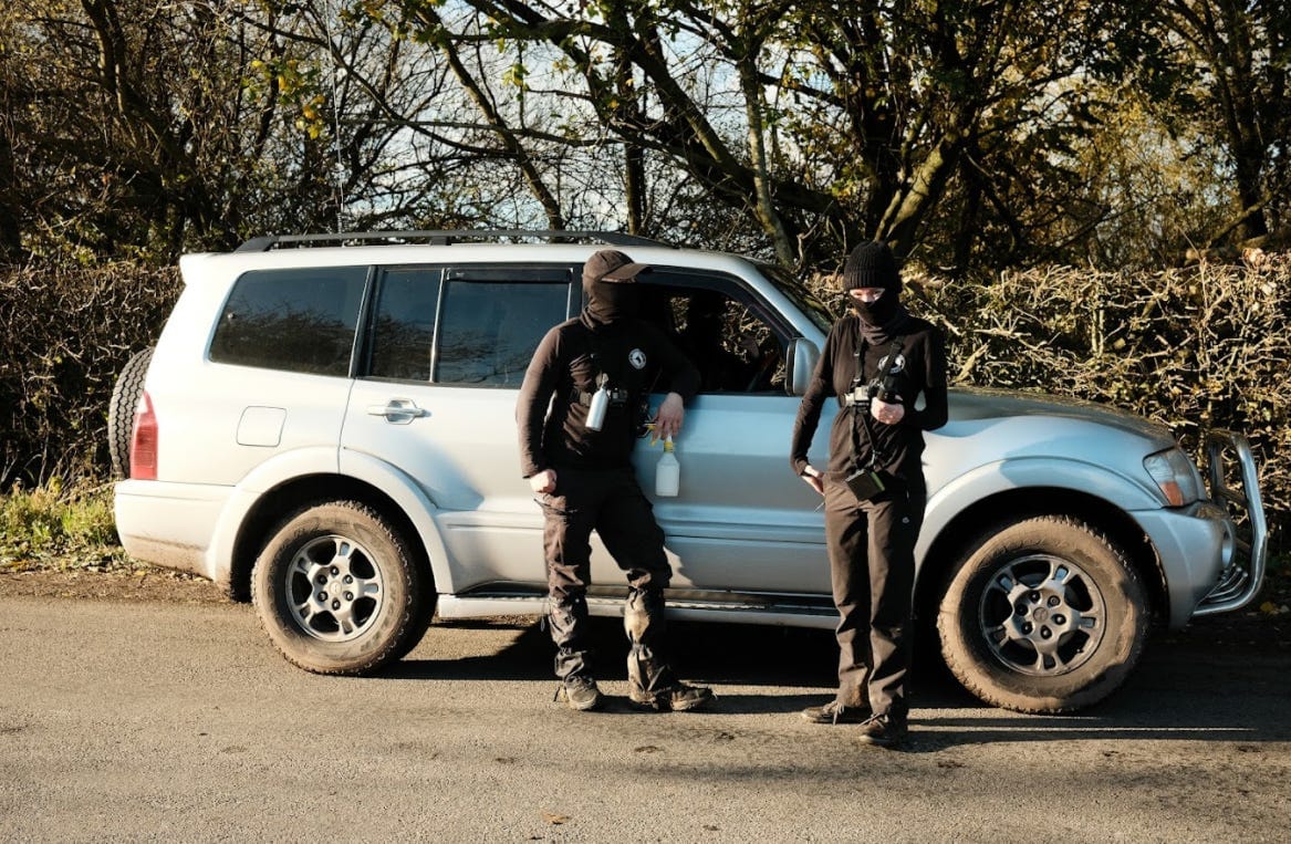 Do the sabs relish this kind of confrontation? Do they come out here, all the way to rural Staffordshire, because they enjoy getting a bit lairy, like football fans who spend 90 minutes shouting at the referee or activists who enjoy smashing shop windows with Antifa? They say they don’t, but it’s clear they love the strategising, the weird outfits and the psychological warfare.