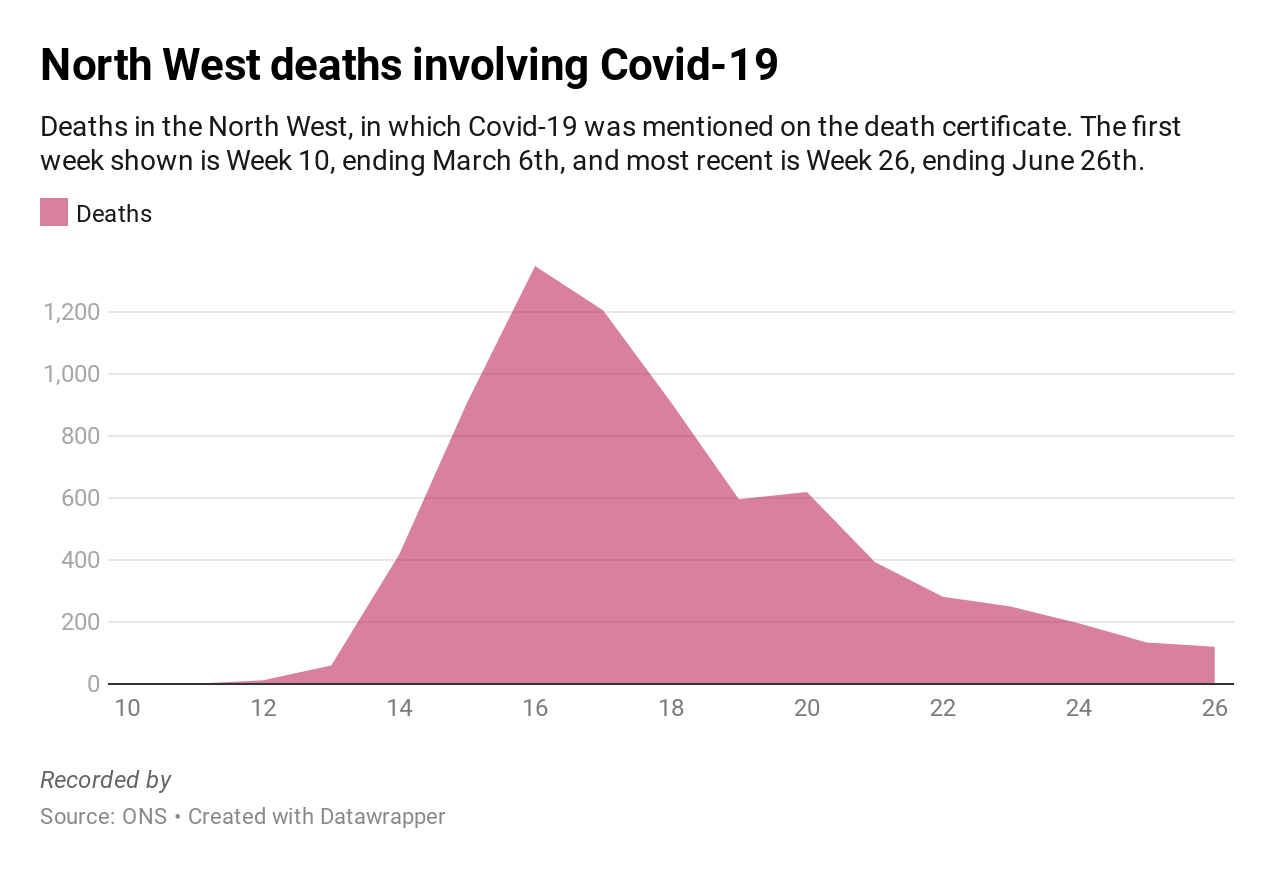 Last week I mentioned figures from the Office of National Statistics (ONS) showing that deaths in the North West (and nationwide) had dipped under the five year average for the first time in a few months. That was for the week ending June 19th. That remains the case across England and Wales, where deaths in the week ending June 26th were 3.4 per cent below the five-year average (314 deaths fewer). But the North West has pushed above its five year average again. Here’s what the ONS press office told me about the week ending June 26th: