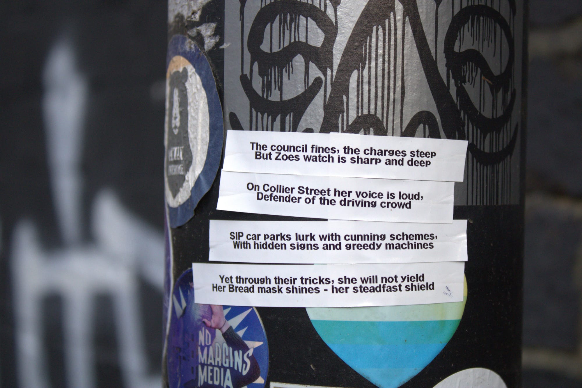 Said signage is now plastered with tributes to Bread: a sticker saying “In Bread we Trust”, another saying “free parking”, even a poem in Bread’s name: