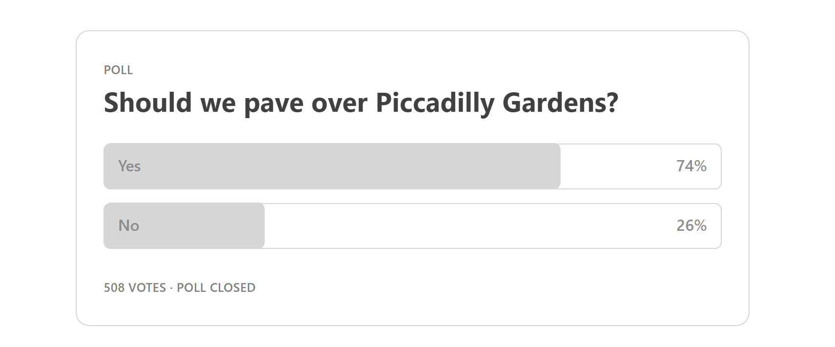Please join in the comments if you have something to add — both the design firm doing the redevelopment and the council have Mill subscriptions and will no doubt be reading your views. More than 500 Millers voted in the poll and 74% of people said they favoured paving over the Gardens.