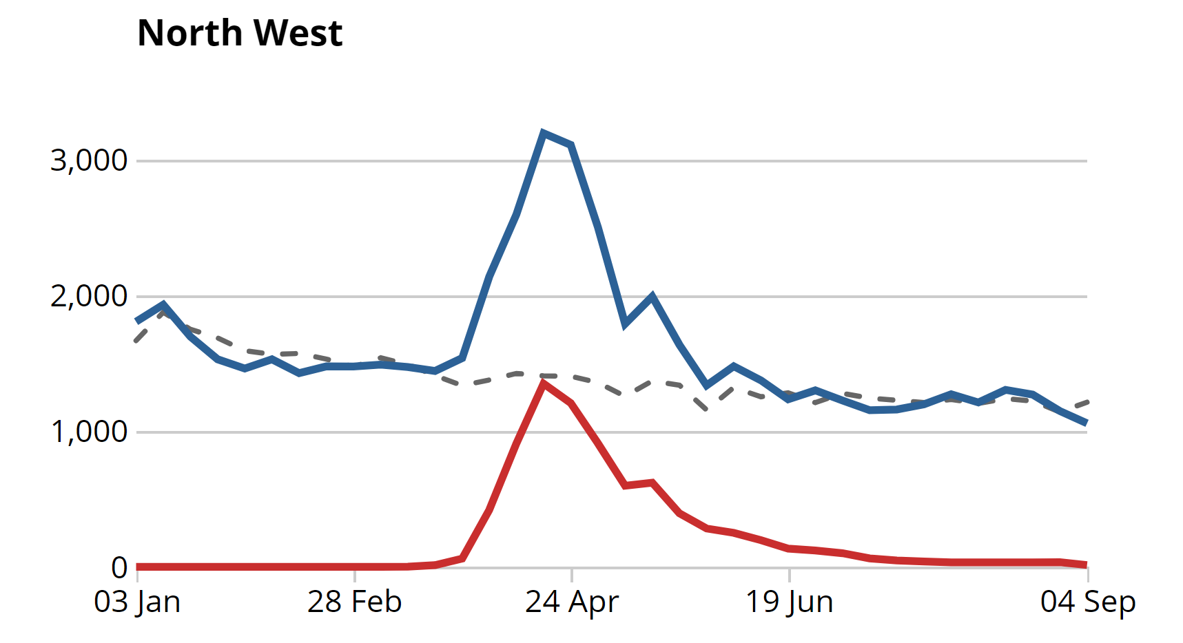 The overall number of deaths in the North West has actually dipped below the five-year average, meaning we are not seeing any ‘excess deaths’ - which we had a lot of in April and May. This chart shows this very clearly. The blue line is total deaths in the region, the dotted grey line shows average deaths in the past five years, and the red line shows Covid deaths. The data goes up to September 4th, the most recent week published by the Office for National Statistics.