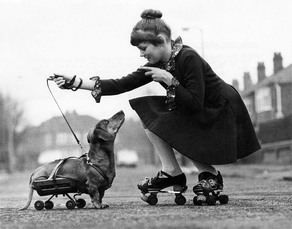 Dachshund Fritz, who hurt his back while “having a go at the postman” in 1973, with his makeshift carriage of roller skate parts. He’s photographed in Manchester alongside 10-year-old Stephanie Light. Photo: Mirrorpix via Getty Images.