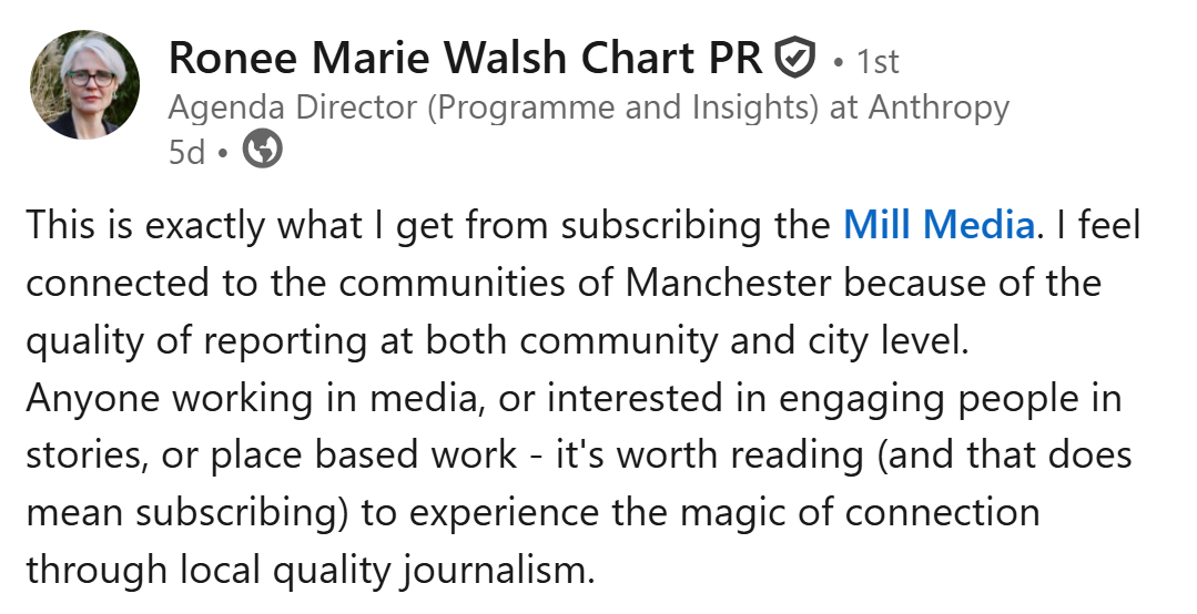 Not only do members get lots of brilliant members-only stories (like Ophira's brilliant piece of sleuthing this week about who has been spraying vigilante-style graffiti about local businesses) and get invited to our events, they also allow us to produce a lot of free journalism for many thousands of Mancunians who can't afford to pay. That's good for the city because local journalism binds people together in a shared community and helps to strengthen civic life.
