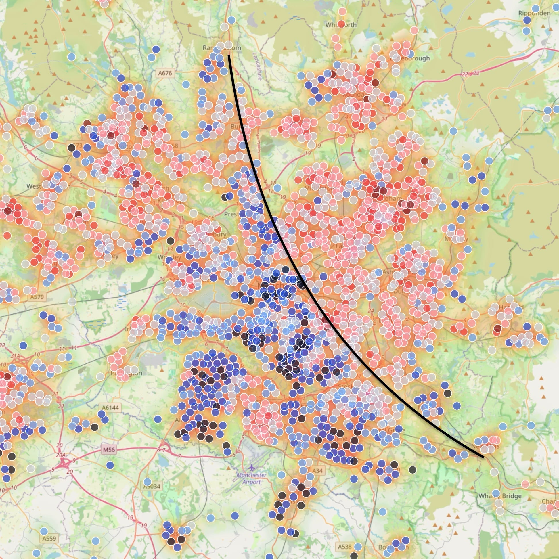 I’ll be honest: I didn’t expect a data nerd’s map to gain the traction it did. It was a simple concept — a map of Greater Manchester and its surroundings with each “centroid” (geolocated population data) overlaid on top, colour-coded for clarity. The blue and red colours represent what the ONS calls “social grade”, essentially a proxy for class: