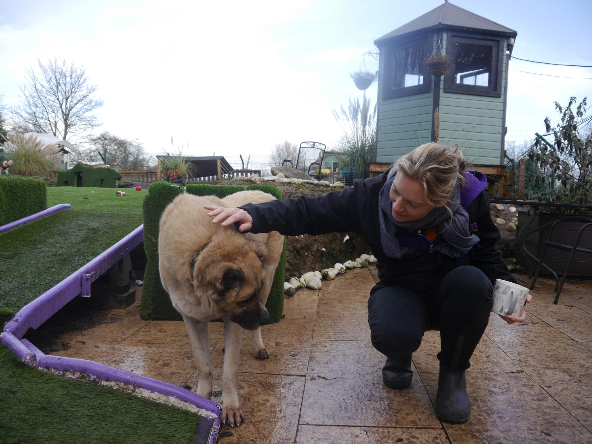 The main part of the sanctuary is occupied by a dozen or so surly dogs who cohabit in harmony. Most of them are uninterested by my presence, wandering over to the other side of the garden to lounge in a spot of bright sunlight. Some are wearing festive jumpers, others run towards silver bowls clattering on the ground filled with hearty Christmas dinners: Yorkshire puddings, a dollop of mash, a handful of peas, carrots, cauliflower florets, chicken, vegan sausages and roast potatoes. “That’s a proper present,” Emma says, explaining you can buy a friend or family member a gift donation towards a dog’s Christmas dinner, and receive a fun video of them enjoying their special banquet in return. “Much better instead of something rubbish, like soap, or whatever.”