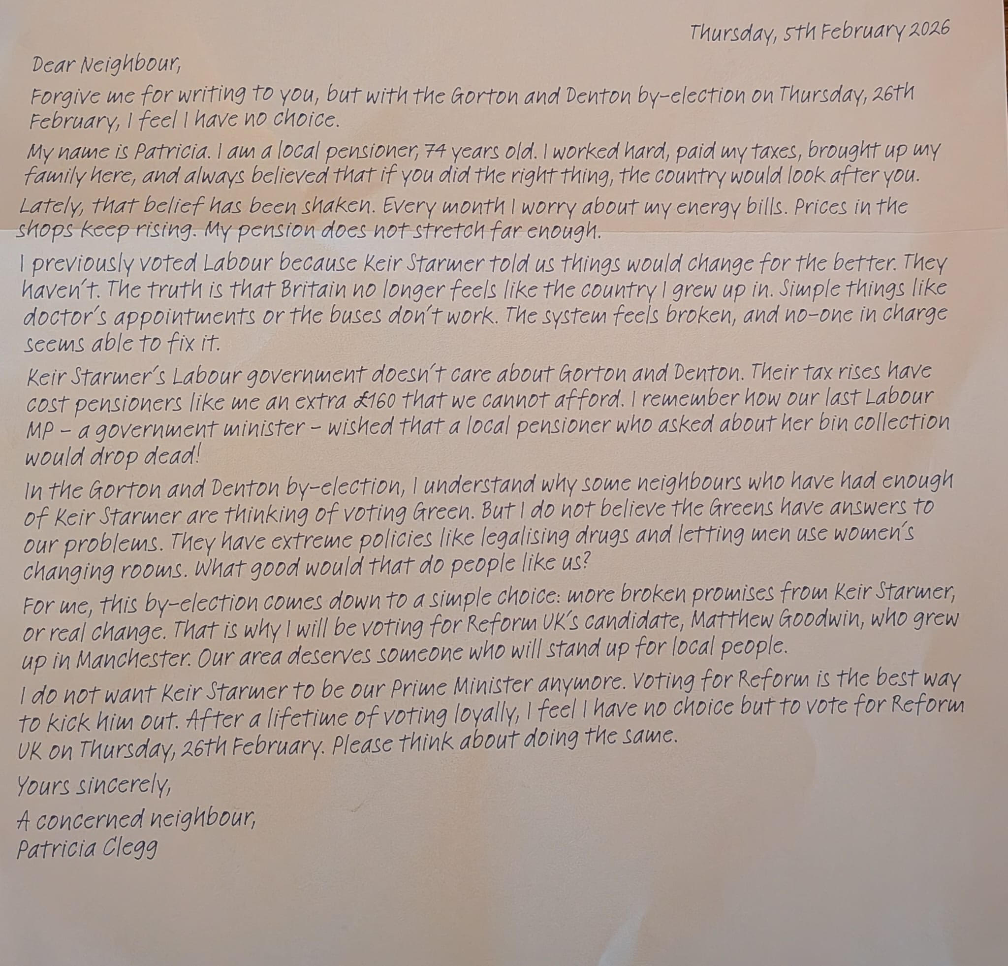 Over the last few hours, The Mill have been contacted by several readers – across Gorton, Denton, and Levenshulme – who have all received the same letter from one concerned pensioner: Patricia Clegg. In the letter – which is printed in faux-handwritten text – Clegg describes herself as 74 years old, now retired, who once “worked hard” and “paid [her] taxes”. She used to be a Labour voter — now she’s not. Now, she’s voting Reform, and she’s urging her ‘neighbours’ to do the same. You can read the full letter here.