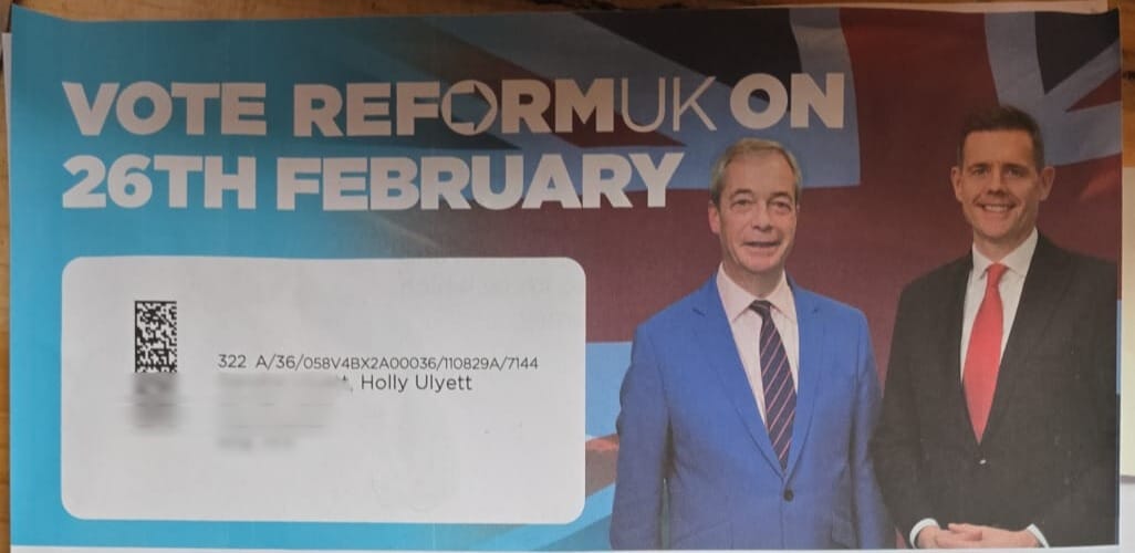 UPDATE: Following publication, a spokesperson for Hardings sent the following statement, via Reform UK: “Hardings Printers has identified an error in the production of election leaflets printed and distributed on behalf of Reform UK for the Gordon & Denton by-election. We take our responsibilities in relation to election material very seriously and take full responsibility for this error occurring. We apologise to Reform UK and the voters of Gordon & Denton for this error.” [sic]