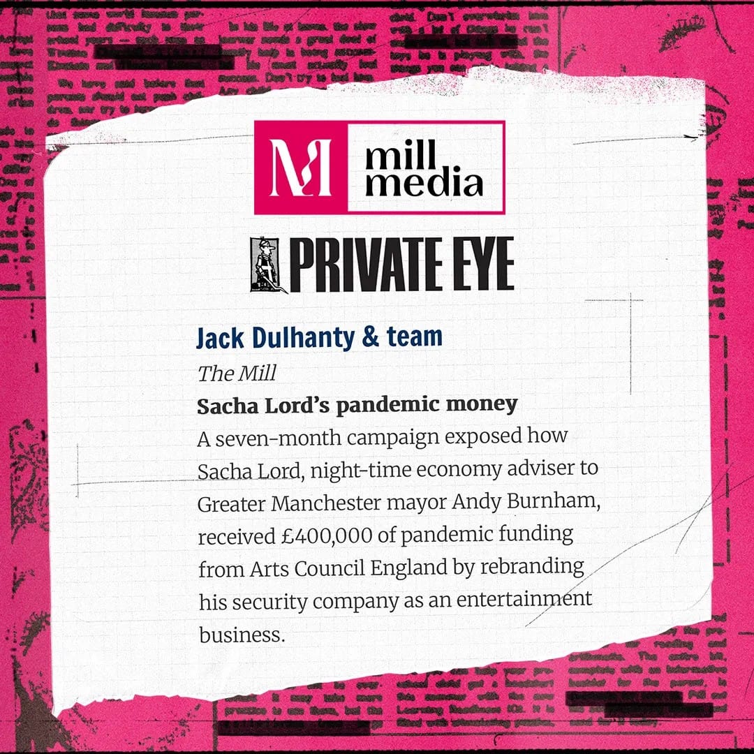 First things first this week: a huge thanks to everyone who sent kind words and well-wishes over the weekend after Jack’s Sacha Lord investigation was nominated for Private Eye’s Paul Foot Award, which commends the best investigative journalism of the past year. It’s a huge deal for us, the first time we’ve ever been up for this one and in a few short days we’ll know if we’ve made the final shortlist (as will our wonderful colleagues in Liverpool, who were also nominated). As one Mill reader, Pam, kindly said: “Brilliant work from Jack but 'Hooray' to the whole team who constantly trawl Manchester for the most interesting, oddball or, in this case explosive stories. This is a really prestigious award.”