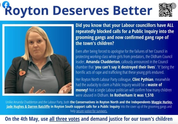 Ever since she was elected as leader a year ago, Miah has trained his guns on Oldham’s latest council leader Amanda Chadderton and his supporters hope to unseat a third leader in a row. The Royton Independents are standing in Royton South in an attempt to unseat Chadderton. Conversely, Labour are being challenged by the Conservatives in Royton North. There’s no evidence to support the suggestion that the parties are working together so as to not split each other’s vote, but both the Royton Independents and the Royton Conservatives have said they support a fresh inquiry into the supposed cover-up of grooming gangs, for which no evidence has so far been produced.