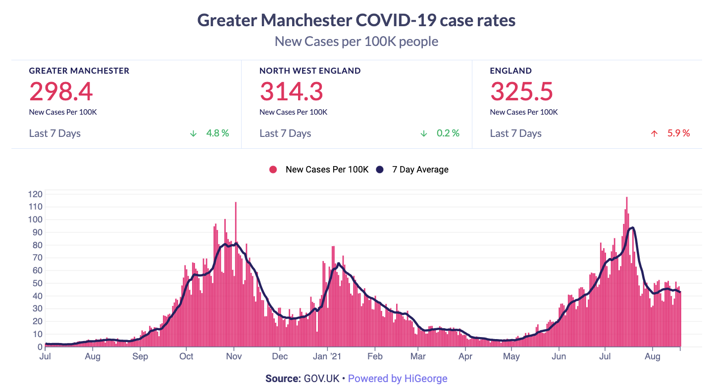- Cases: The case rate for Greater Manchester is 298.4, down 4.8% from last week, compared to England’s 325.5, up 5.9%. Infection rates are highest in Tameside, around 300. The lowest is in Bolton, in the region of 200.