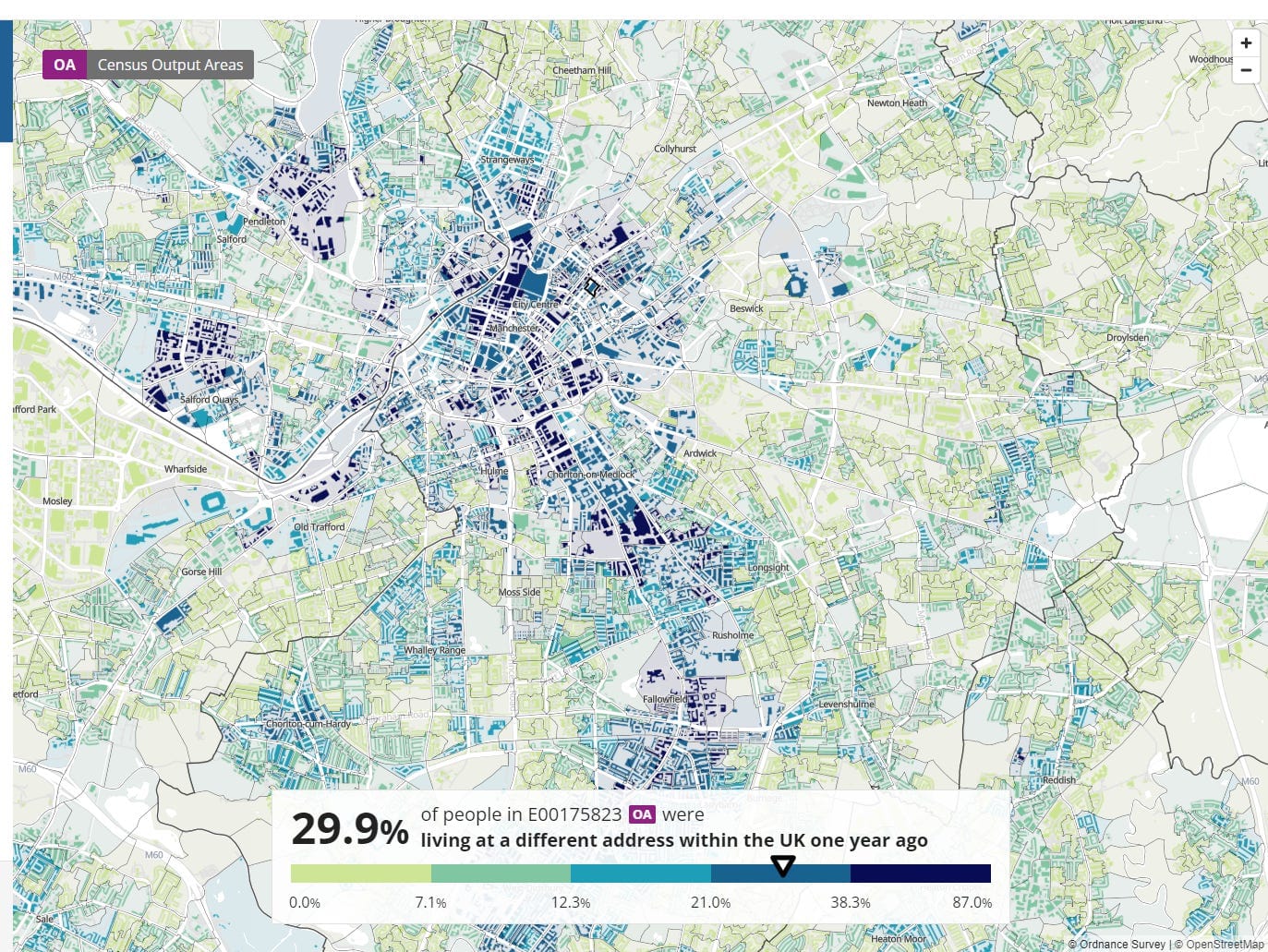 We enjoyed this Reddit thread about Manchester’s most transient areas — the ones where the highest proportion of people were living at a different address a year ago. It was started by a poster who wanted to know where the newcomers to Manchester are settling and thought this map (below) might offer a clue (“I can never find any data on whether there really are lots of people from up from London / SE or if it's just one of those ‘bloke down the pub said’ things” they wrote). But as many people pointed out, it probably just shows us which areas have more students and renters rather than homeowners. Still, it’s interesting — particularly some of the stark contrasts like the border between gentrified Ancoats/New Islington and Beswick/Ardwick. Check the percentage for your area on the ONS website.