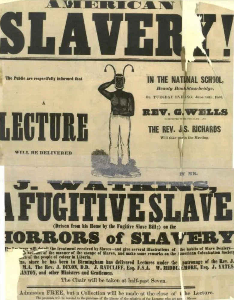 A poster advertising one of Watkins’ lecture, in Stourbridge. The illustration shows Watkins wearing a “yoke” with bells attached, which he was made to wear for three months as a punishment for trying to escape.