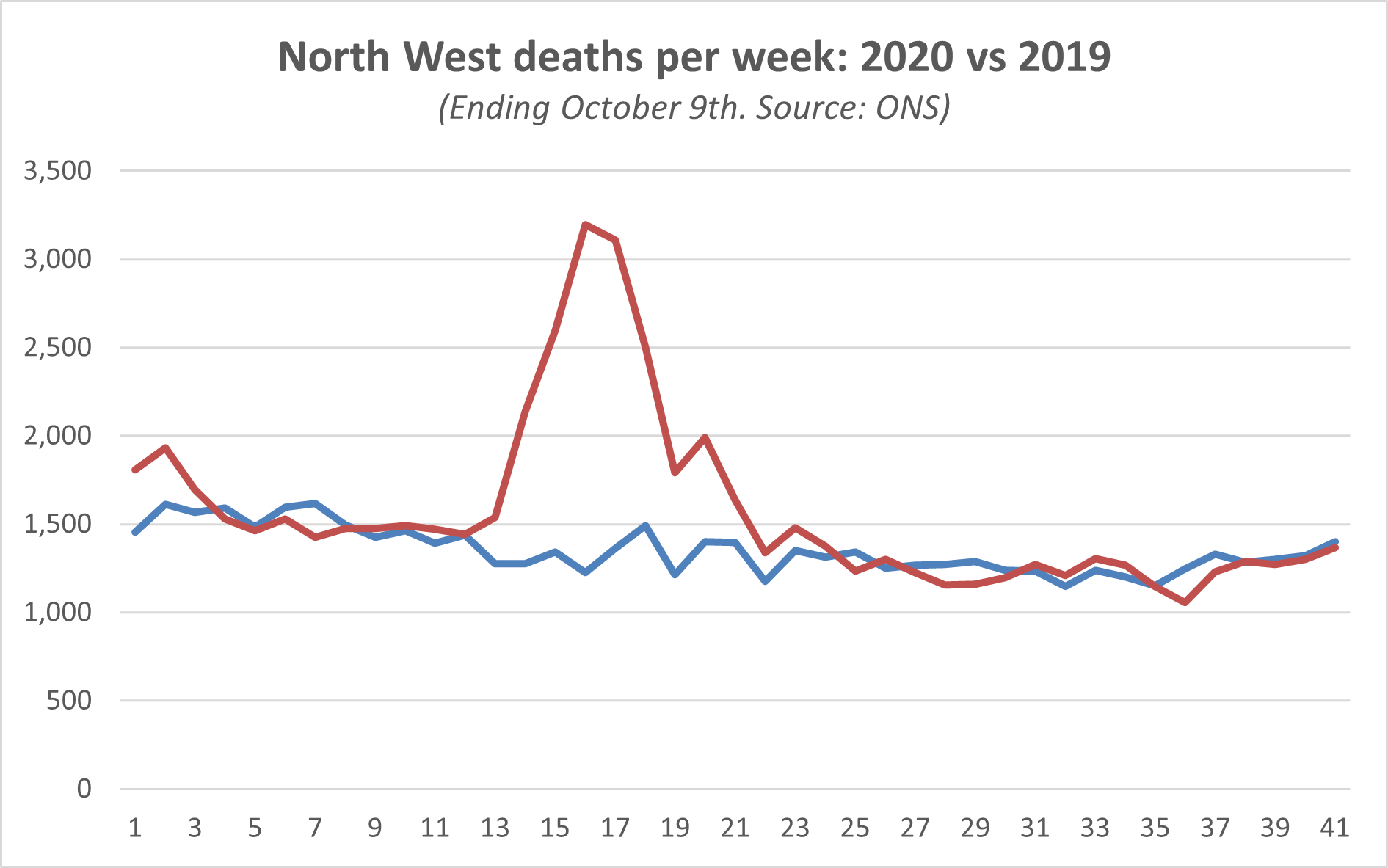 And finally: If you are looking for more positive news, the latest data release from the Office of National Statistics shows that in the week ending October 9th, there were actually fewer overall deaths (from all causes) in the North West than in the same week last year. Here’s how the graph looks comparing this year’s deaths (the red line) to last year, showing a lot of what are known as “excess deaths” this year in the Spring, but none recently. For context, in that week ending October 9th we were seeing around 8 Covid deaths per day in Greater Manchester’s hospitals.