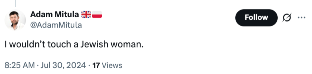 Mitula’s output, posted on social media, includes his suggestion that “60-70%” of transgender people are paedophiles, the fact he would “never touch a Jewish woman”, and his use of the n-word. Meanwhile, discussing the number of people who died in the Holocaust in July 2024, he appears to try and play down the statistics, writing: “6 million polish [sic] people including some Jews. They always use Poles to make up the number. And on top of it they claim Poles were killing. Just sick.”