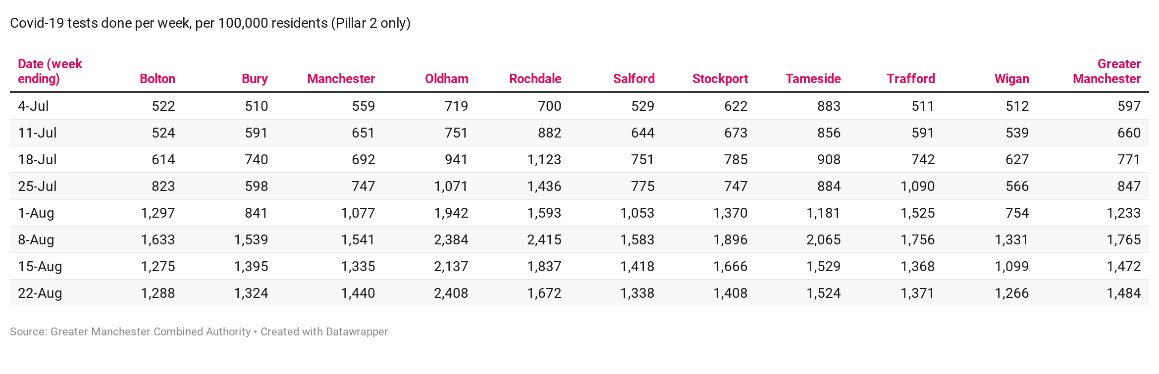 What they show is very significant increases in testing across Greater Manchester this summer, rising from 597 tests per 100,000 residents in the first week of July to 1765 tests per 100,000 residents in the first week of August. Since then they have fallen slightly, mainly because Rochdale has reduced its testing from a very high peak earlier in the month. (If you click on the table it should take you to a larger version).