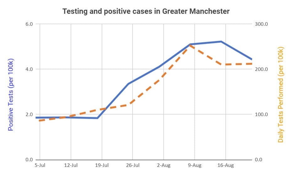 Is it possible that after an initial spike in infection rates in Greater Manchester, that ramped-up testing was driving what looked like dramatic increases in the infection rate? Or to put it another way: was the actual amount of the virus in our neighbourhoods actually growing as fast as we thought it was, or were we just finding more of it because we were testing much, much more than we were at the start of July?