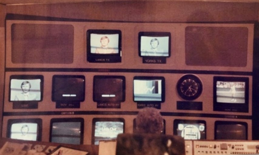 This was the pre-digital mid-Seventies. The Central Control Room at Granada Television on Manchester’s Quay Street looked like something out of the Starship Enterprise, a two-person flight desk facing a six-by-four bank of grey, convex screens. Transmission teams worked in pairs, the senior partner issuing instructions, the junior operating the desk. The assistant was like the controller’s arms and legs. The controller was there to troubleshoot and answer the red telephones when a problem was called in from across the network.