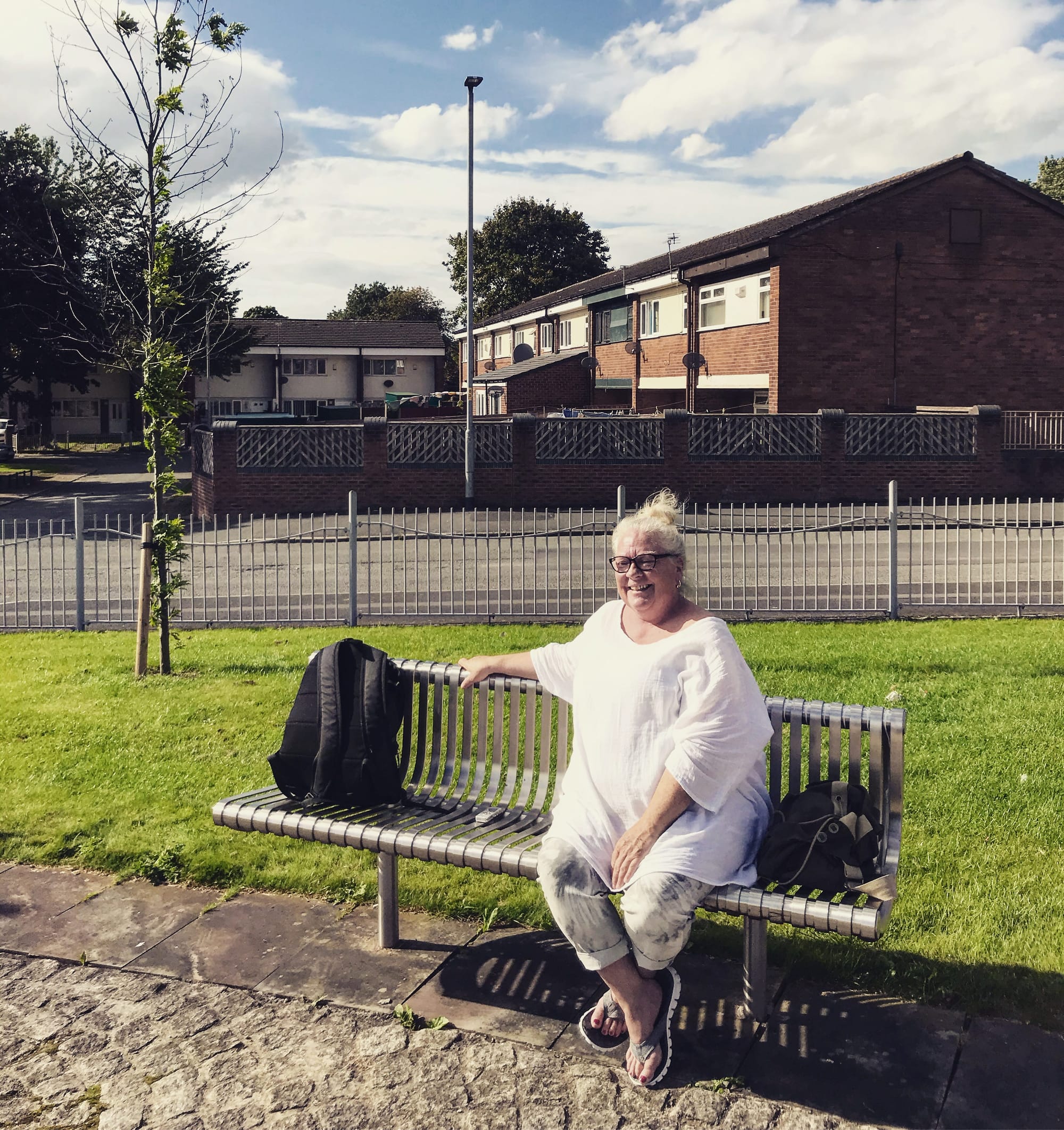 Elaine, with the neighbourhood’s 1960s council housing behind her