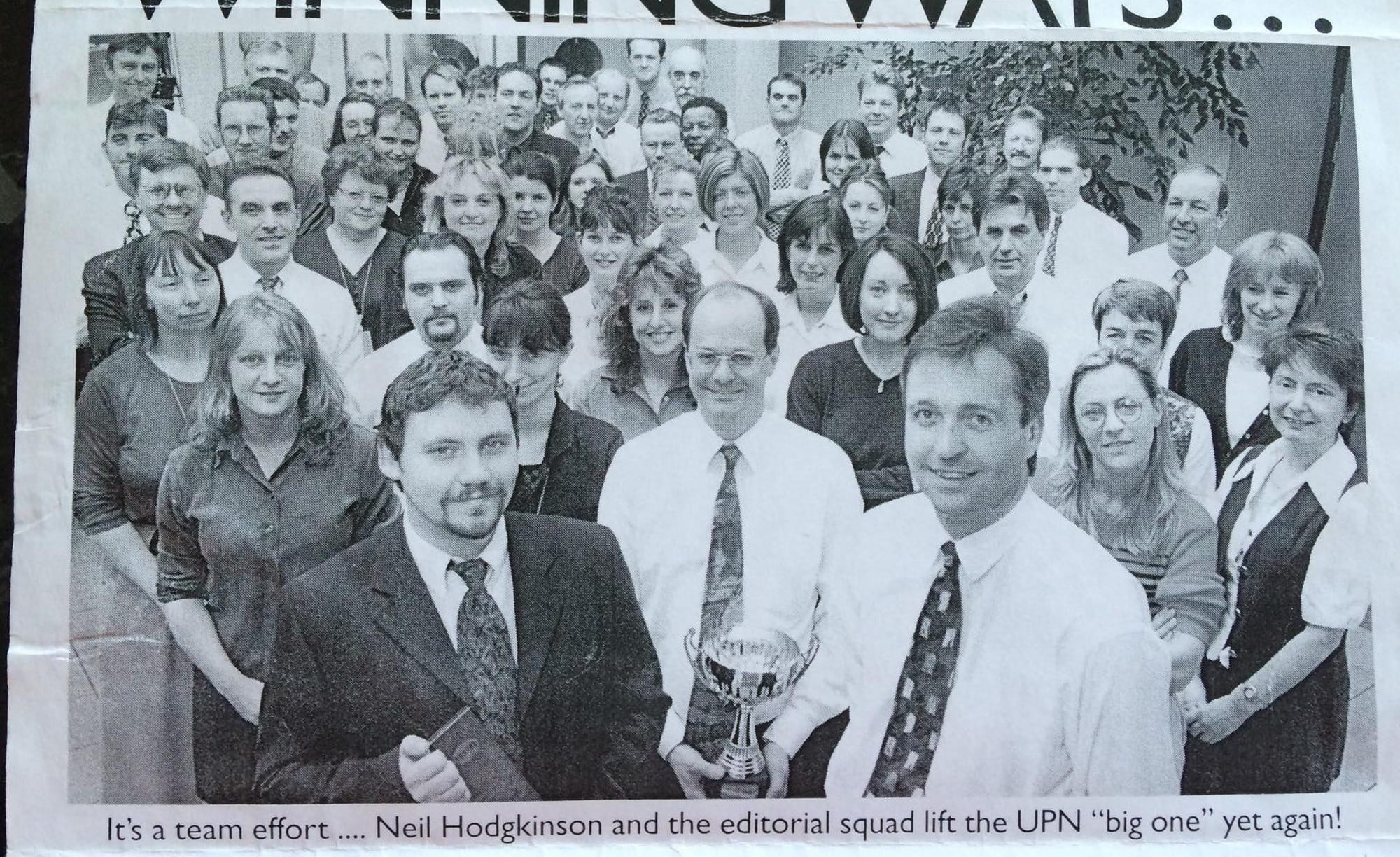 The (big) staff of the Lancashire Evening Post in 1998. That’s me front left with a goatee.
