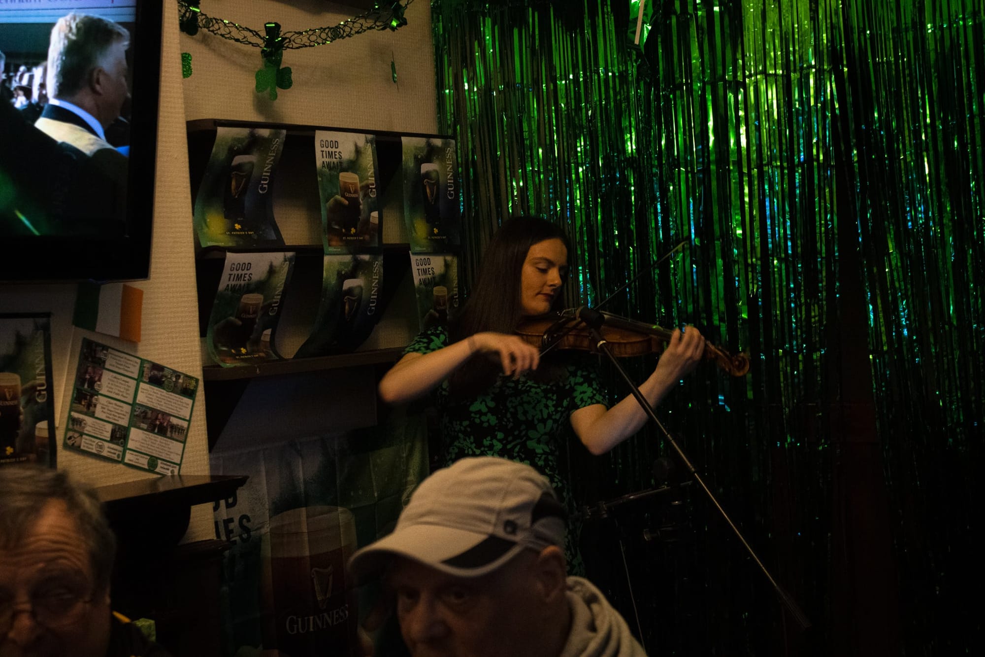 But this year it’ll close, making this its last Saint Patrick’s Day. Before the evening even really begins, the place is too full to let anyone else in. The bar is an island in a sea of bodies crushing up against it. In the booths along the back wall, grandfathers and grandmas sit in crisp blazers with big lapels or green knit jumpers and patterned dresses, whispering to one another and giving a thumbs up to their kids at the bar, who are giving the universal hand signal for “a drink?”