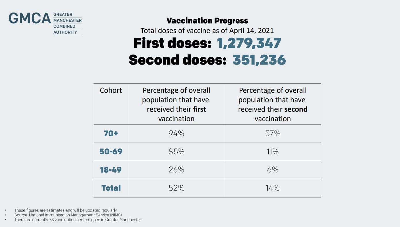 - Vaccinations: 52% of adults in GM have had their first dose of one of the vaccines, and 14% have now had both doses. Amazingly, those numbers are 94% and 57% for the over-70s. See the graphic below for more details.