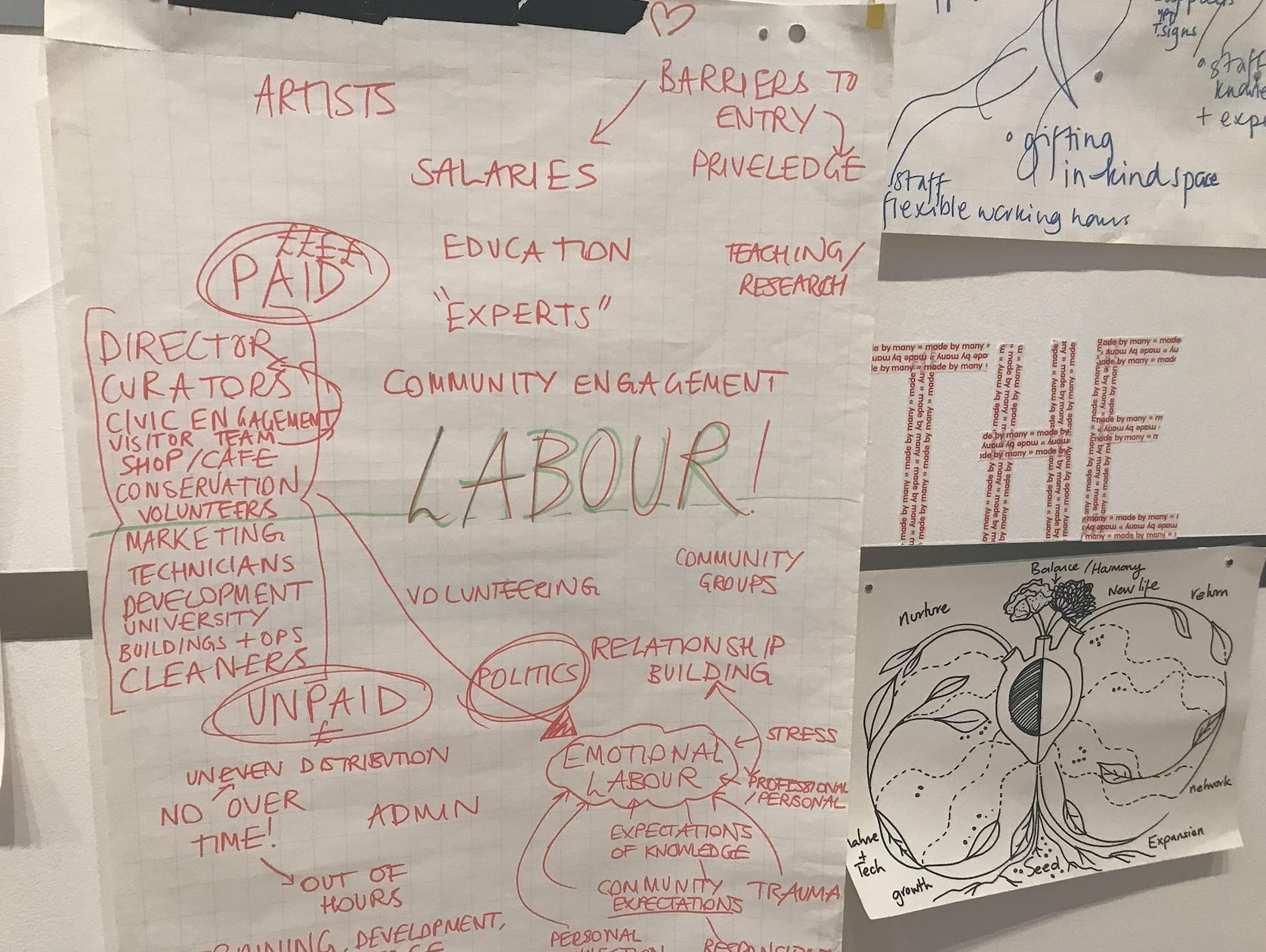 The engaging, accessible part is that there are tables with papers and pens and you’re encouraged to draw economic shapes. Economic shapes? Like a growth curve, the curator says, gesturing to an image of it. This is what the economy has traditionally been based around and we are now seeing the weakness of that ideology. What would be another economic shape well-known enough that the average non-economist might draw it? The doughnut, apparently — like the doughnut economy?